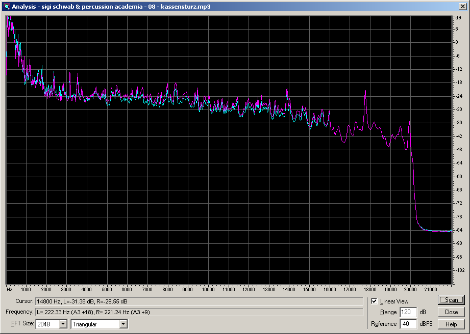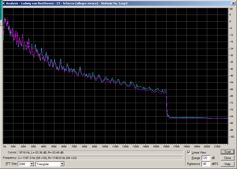 For each song there are four plots. Left is the original .wav for reference. First row is a frequency range analysis over the wohle piece, second row is a spectral (often referred to as voiceprint) view of the file. While the frequency range analysis shows the overall frequency response of the encoder and shows errors in stereo separation, the spectral view shows accuracy. Low sound levels are of dark colours, higher levels are brightly coloured (red to yellow to white).