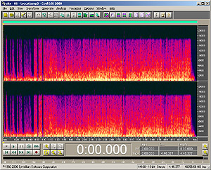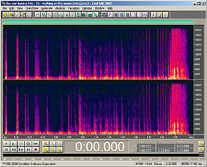 In spectral view, the workings of the psycho-acoustic model used in mp3 encoding are quite visible - removing most of the lower sound level frequencies of a signal if a louder set of different frequency(s) is present.